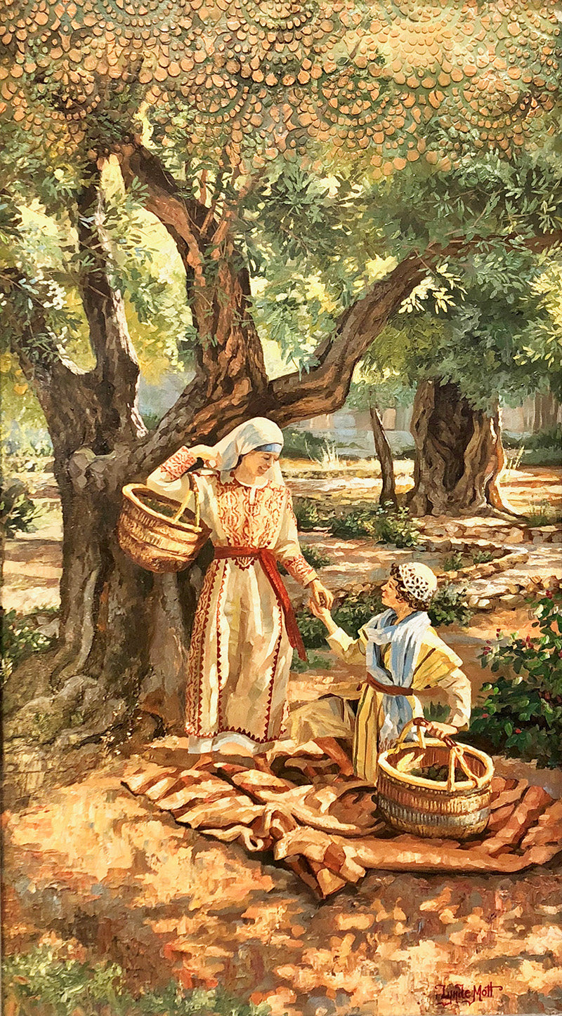 The background for this paining was taken in Jerusalem outside the Church of Many Nations in the traditional site of the Garden of Gethsemane.