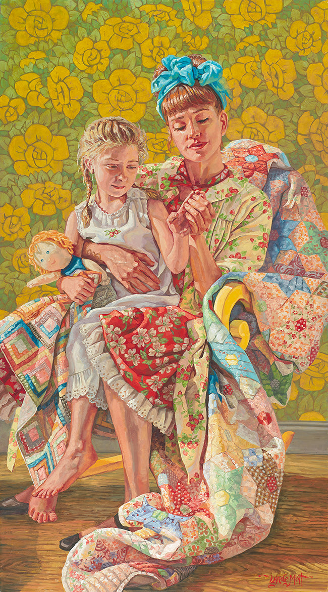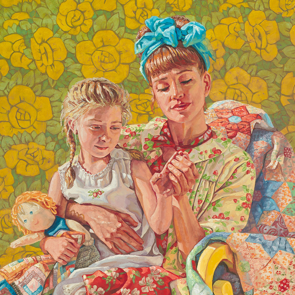 This scene is proper to the early 1950’s. The girl holds her yarn haired cloth doll and diminutive Log Cabin patterned quilt. Her mother wears a casual strawberry motif smock over her red housedress that was probably a former best dress of several years earlier. The stylized, floral wallpaper resonates the colorful modern art of the post war period.