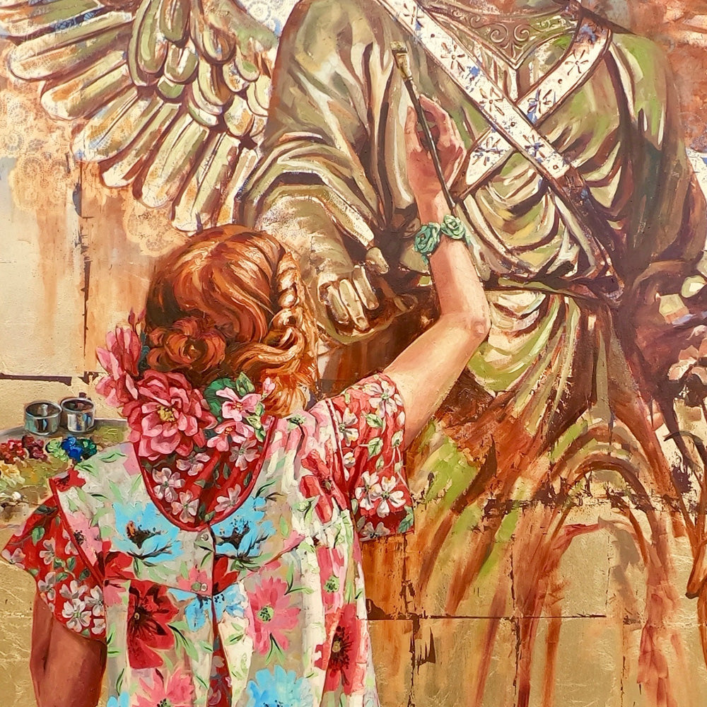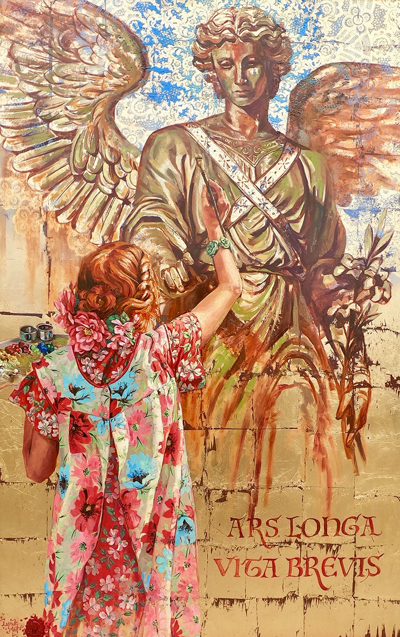 I love how the two tone frame turned out, as well as the custom holly stencil that I cut out specifically for this project. Covering the entire background first in gold leaf gave it an immediate ethereal and atmospheric bling. This monumentally sized piece reminds me of an ancient Latin saying, “Ars Longa, Vita Brevis or Life is short, Art is long.”